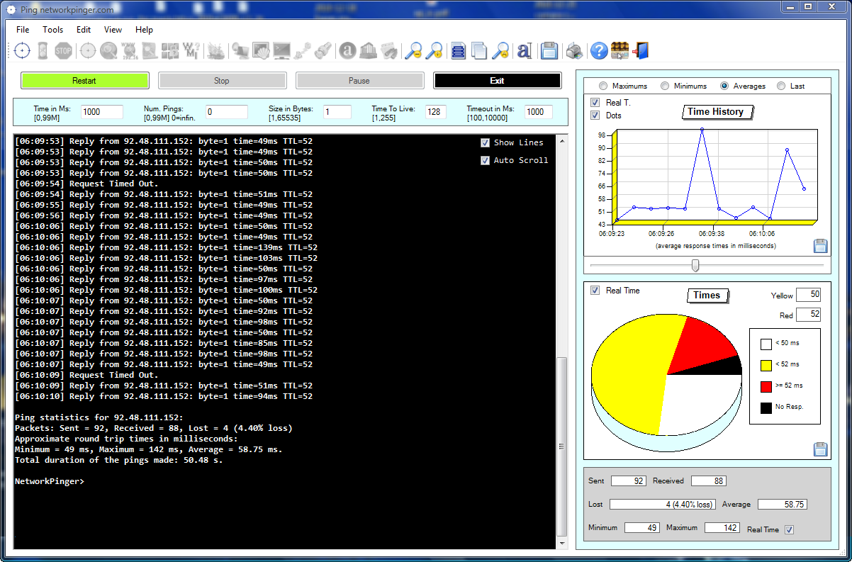 - Auto Scroll - Esta opção torna-se necessária não só por razões de performance, como também por gosto pessoal de cada um ou necessidade. Em termos de performance, será pela mesma razão da opção anterior, em caso de querermos fazer pings com muito poucos milissegundos de espera entre cada um, em que cada milissegundo extra fará a diferença, podemos desactivar esta opção e veremos um aumento na velocidade dos pings, pois haverá menos procedimentos, neste caso o auto scroll, no espaço de tempo em que um ping termina e começa o outro. No caso referente ao gosto pessoal de cada um ou necessidade, refere-se ao facto de um utilizador poder gostar, ou necessitar, de ter o histórico dos pings parado num dado local, sem que haja um auto scroll que nos leve a posição do cursor para o fim do histórico dos pings, algo que nos faria perder de vista a posição actual do ecrã aquando de cada resposta de ping recebida. Torna-se assim necessária para alguns esta opção.